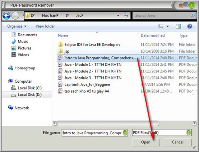 Chọn file PDF cần phá mật khẩu > Open