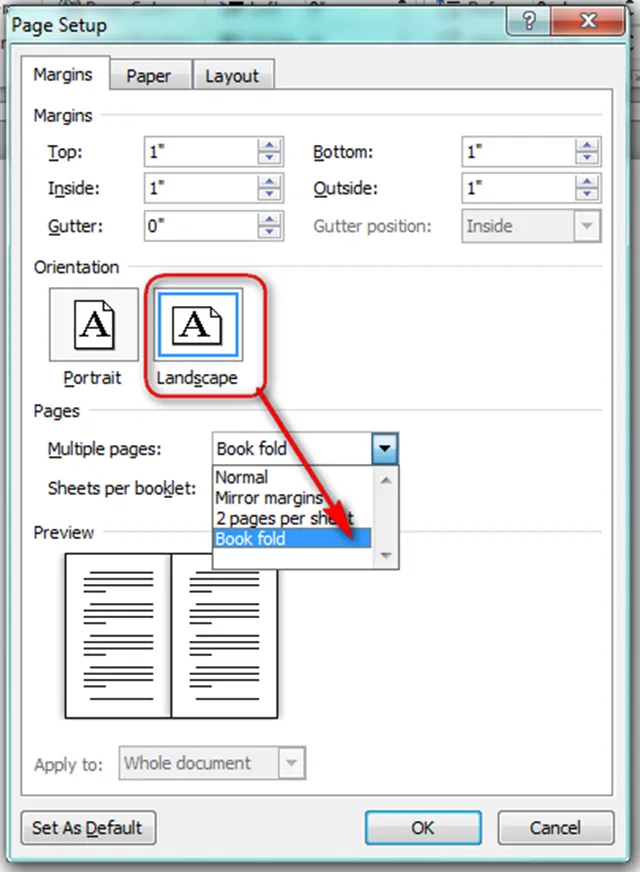 - Chọn landscape > book fold